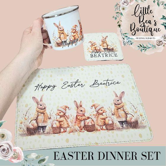 Easter Dinner Table Set Placemats - 3 Piece Bundle with Customised Named Enamel Mug, Placemat & Coaster - Tableware - Add Any name, Easter Gifts for Kids